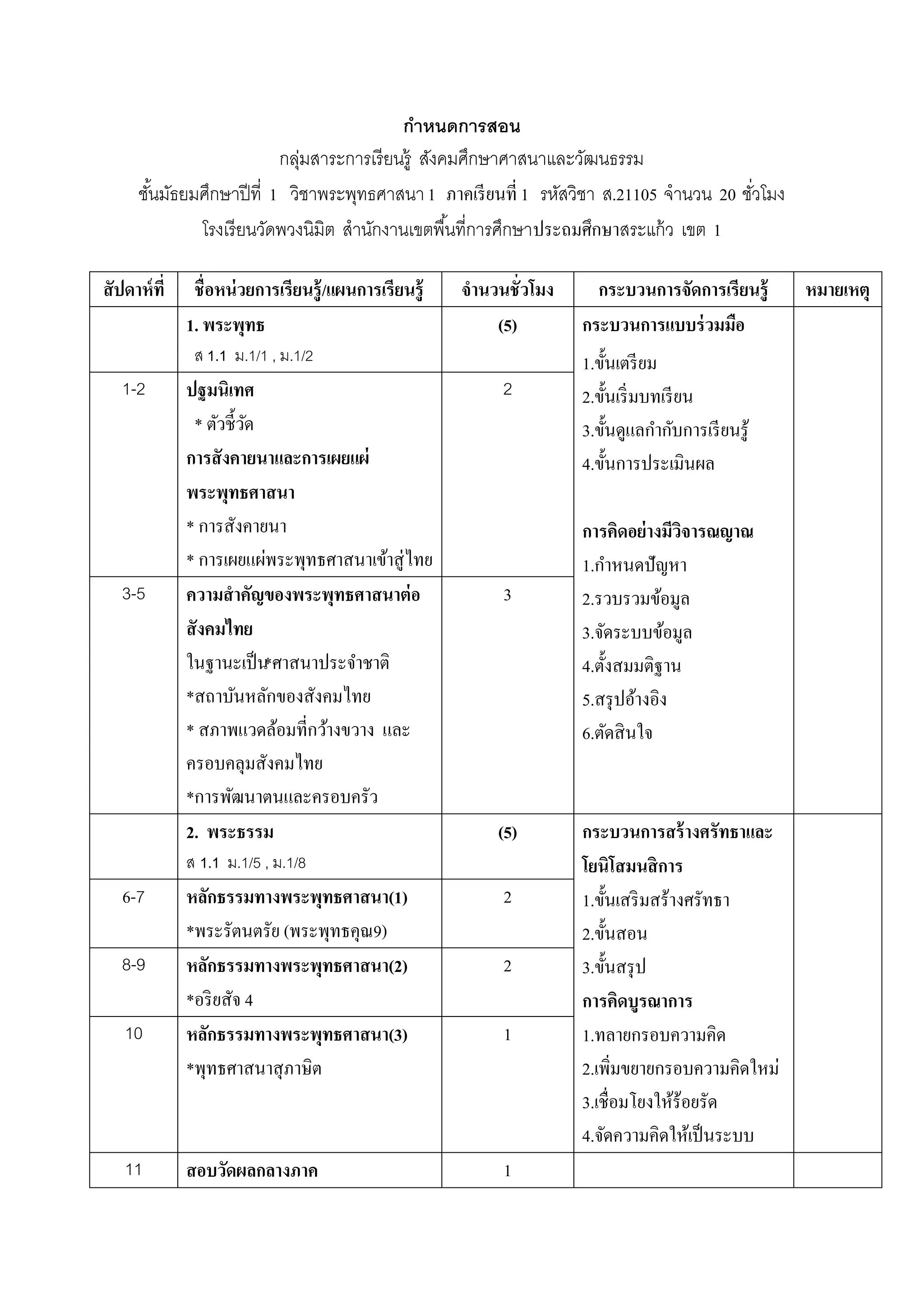 ํ กลมสาระการเรียนร้ ู สงคมศกษาศาสนาและวฒนธรรม ุ่ ั ึ ั ชนมธยมศกษาปีที่ 1 วิชาพระพุทธศาสนา 1 ภาคเรี ยนที่ 1 รหัสวิชา ส.21105 จํานวน 20 ชวโมง ั้ ั ึ ั่ โรงเรี ยนวัดพวงนิมิต สํานกงานเขตพื ้นที่การศกษาประถมศึกษาสระแก้ ว เขต 1 ั ึ สั ปดาห์ ที่ ชื่ อหน่ วยการเรียนรู้/แผนการเรียนร้ ู จํานวนชั่ วโมง กระบวนการจัดการเรียนร้ ู หมายเหตุ 1. พระพุทธ (5) กระบวนการแบบร่ วมมือ ส 1.1 ม.1/1 , ม.1/2 1.ข้นเตรียม ั 1-2 ปฐมนิเทศ 2 2.ขั้นเริ่ มบทเรี ยน * ตัวชี้วด ั ํ ั 3.ข้นดูแลกากบการเรียนรู้ ั การสั งคายนาและการเผยแผ่ 4.ข้นการประเมินผล ั พระพุทธศาสนา * การสังคายนา การคิดอย่ างมีวจารณญาณ ิ * การเผยแผ่พระพุทธศาสนาเข้าสู่ ไทย ํ 1.กาหนดปัญหา 3-5 ความสํ าคัญของพระพุทธศาสนาต่ อ 3 2.รวบรวมข้อมูล สั งคมไทย 3.จัดระบบข้อมูล ในฐานะเป็น*ศาสนาประจําชาติ 4.ตั้งสมมติฐาน *สถาบันหลักของสังคมไทย 5.สรุ ปอ้างอิง * สภาพแวดล้อมที่กว้างขวาง และ 6.ตดสินใจ ั ครอบคลุมสังคมไทย *การพัฒนาตนและครอบครัว 2. พระธรรม (5) กระบวนการสร้างศรัทธาและ ส 1.1 ม.1/5 , ม.1/8 โยนิโสมนสิการ 6-7 หลกธรรมทางพระพุทธศาสนา(1) ั 2 1.ขั้ นเสริ มสร้างศรัทธา *พระรัตนตรัย (พระพุทธคุณ9) 2.ขั้ นสอน 8-9 หลกธรรมทางพระพุทธศาสนา(2) ั 2 3.ข้ นสรุป ั *อริ ยสัจ 4 การคิดบูรณาการ 10 หลกธรรมทางพระพุทธศาสนา(3) ั 1 1.ทลายกรอบความคิด *พุทธศาสนาสุ ภาษิต 2.เพิ่มขยายกรอบความคิดใหม่ 3.เชื่อมโยงใหร้อยรัด ้ 4.จดความคิดใหเ้ ป็นระบบ ั 11 สอบวัดผลกลางภาค 1