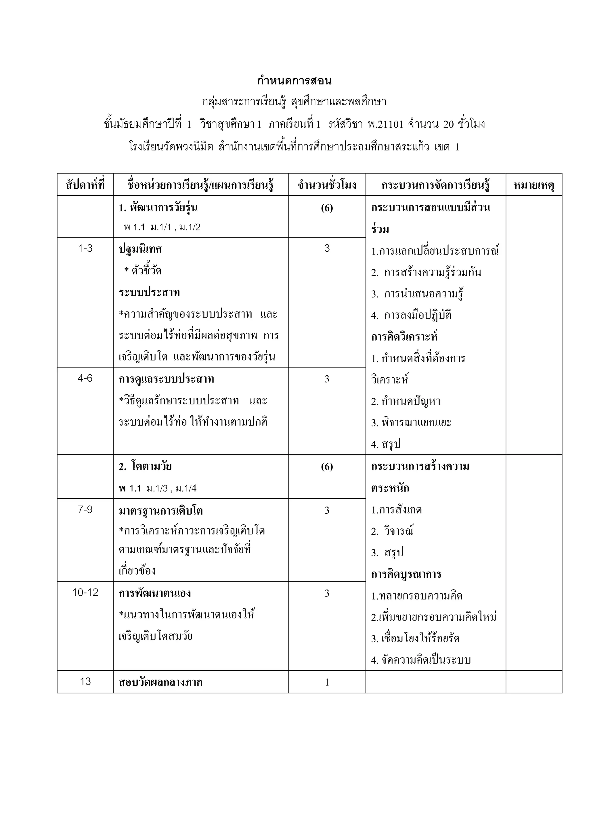 ํ กลมสาระการเรียนร้ ู สขศกษาและพลศกษา ุ่ ุ ึ ึ ชนมธยมศกษาปีที่ 1 วิชาสุ ขศึกษา 1 ภาคเรี ยนที่ 1 รหัสวิชา พ.21101 จํานวน 20 ชวโมง ั้ ั ึ ั่ โรงเรี ยนวัดพวงนิมิต สํานกงานเขตพื ้นที่การศกษาประถมศึกษาสระแก้ ว เขต 1 ั ึ สั ปดาห์ ที่ ชื่ อหน่ วยการเรียนรู้/แผนการเรียนร้ ู จํานวนชั่ วโมง กระบวนการจัดการเรียนร้ ู หมายเหตุ 1. พฒนาการวยรุ่ น ั ั (6) กระบวนการสอนแบบมีส่วน พ 1.1 ม.1/1 , ม.1/2 ร่วม 1-3 ปฐมนิเทศ 3 1.การแลกเปลี่ยนประสบการณ์ * ตัวชี้วด ั 2. การสร้างความรู ้ร่วมกัน ระบบประสาท 3. การนําเสนอความรู ้ *ความสําคัญของระบบประสาท และ 4. การลงมือปฏิบติ ั ระบบต่อมไร้ท่อที่มีผลต่อสุ ขภาพ การ การคิดวิเคราะห์ เจริ ญเติบโต และพัฒนาการของวัยรุ่ น 1. กําหนดสิ่ งที่ตองการ ้ 4-6 การดูแลระบบประสาท 3 วิเคราะห์ *วิธีดูแลรักษาระบบประสาท และ ํ 2. กาหนดปัญหา ระบบต่อมไร้ท่อ ให้ทางานตามปกติ ํ 3. พิจารณาแยกแยะ 4. สรุป 2. โตตามวัย (6) กระบวนการสร้ างความ พ 1.1 ม.1/3 , ม.1/4 ตระหนัก 7-9 มาตรฐานการเติบโต 3 1.การสังเกต *การวิเคราะห์ภาวะการเจริ ญเติบโต 2. วิจารณ์ ตามเกณฑ์มาตรฐานและปั จจัยที่ 3. สรุป เกี่ยวของ้ การคิดบูรณาการ 10-12 การพฒนาตนเอง ั 3 1.ทลายกรอบความคิด *แนวทางในการพฒนาตนเองให้ ั 2.เพิ่มขยายกรอบความคิดใหม่ เจริญเติบโตสมวยั 3. เชื่อมโยงใหร้อยรัด ้ 4. จดความคิดเป็นระบบ ั 13 สอบวัดผลกลางภาค 1