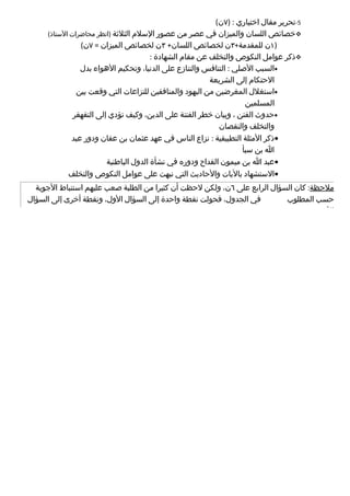 تتناول الوثيقة تصحيح امتحان مادة علم الاجتماع، حيث تتضمن أسئلة حول معنى القراءة والتراث وفوائد قراءة التراث. كما تبرز مقارنة بين رؤية الكاتب والرؤية الدارسة، بالإضافة إلى مناقشة المحن الكبرى التي عانت منها الأمة الإسلامية وعوامل النكوص والتخلف.