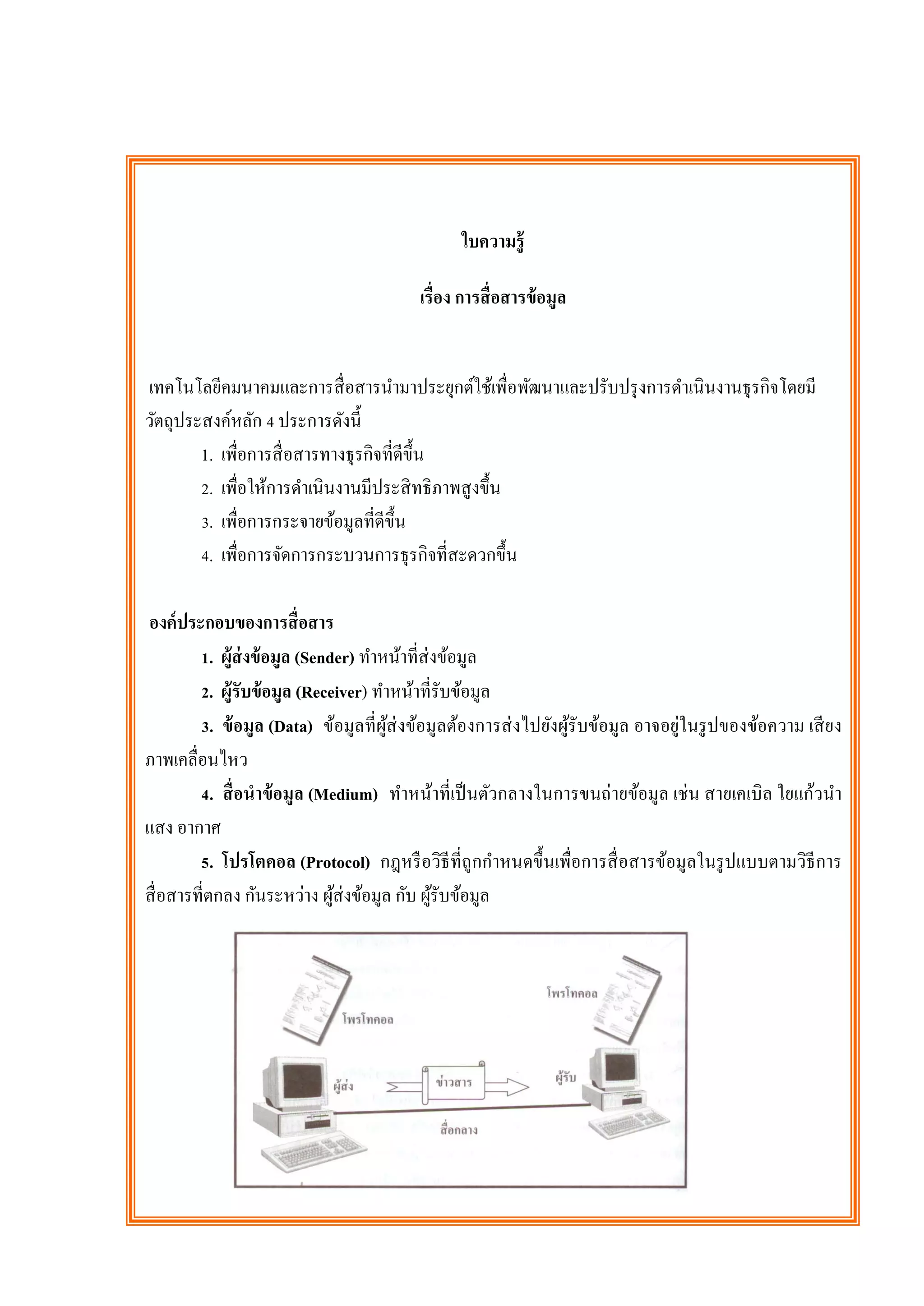 เรื่อง การสื่ อสารข้ อมูล เทคโนโลยีคมนาคมและการสื่ อสารนามาประยุกต์ใช้เพื่อพัฒนาและปรับปรุ งการดาเนิ นงานธุ รกิจโดยมี วัตถุประสงค์หลัก 4 ประการดังนี้ 1. เพื่อการสื่ อสารทางธุ รกิจที่ดีข้ ึน 2. เพื่อให้การดาเนินงานมีประสิ ทธิ ภาพสู งขึ้น 3. เพื่อการกระจายข้อมูลที่ดีข้ ึน 4. เพื่อการจัดการกระบวนการธุ รกิจที่สะดวกขึ้น องค์ ประกอบของการสื่ อสาร 1. ผู้ส่งข้ อมูล (Sender) ทาหน้าที่ส่งข้อมูล 2. ผู้รับข้ อมูล (Receiver) ทาหน้าที่รับข้อมูล 3. ข้ อมูล (Data) ข้อมูลที่ผส่งข้อมูลต้องการส่ งไปยังผูรับข้อมูล อาจอยู่ในรู ปของข้อความ เสี ยง ู้ ้ ภาพเคลื่อนไหว 4. สื่ อนาข้ อมูล (Medium) ทาหน้าที่เป็ นตัวกลางในการขนถ่ายข้อมูล เช่ น สายเคเบิล ใยแก้วนา แสง อากาศ 5. โปรโตคอล (Protocol) กฎหรื อวิธีท่ีถูกกาหนดขึ้นเพื่อการสื่ อสารข้อมูลในรู ปแบบตามวิธีการ สื่ อสารที่ตกลง กันระหว่าง ผูส่งข้อมูล กับ ผูรับข้อมูล ้ ้