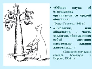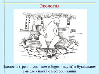 Документ описывает развитие и состояние экологии как науки, начиная с ее истоков и первых исследований до современных проблем, связанных с антропогенным воздействием на окружающую среду. Он анализирует последствия техногенного прогресса, такие как загрязнение, истощение ресурсов и проблемы с продовольствием и водой, а также возрастающую озабоченность обществом относительно экологических кризисов. Текст подчеркивает необходимость переосмысления отношения человека к природе и подводит к выводу о важности экологической ответственности.