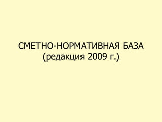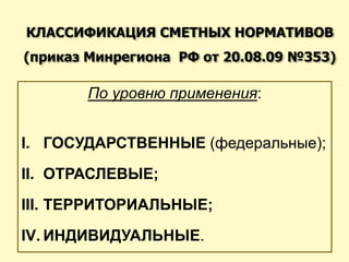 Документ описывает сметно-нормативную базу России, классифицируя сметные нормативы на четыре уровня: государственные, отраслевые, территориальные и индивидуальные с примерами каждого вида. В нем представлены изменения в нормативной базе по оплате труда, эксплуатированию машин, сметной стоимости материалов и методические указания, касающиеся нормативов. Также указаны цели и задачи нормативов, такие как планирование и подготовка технико-экономических показателей.
