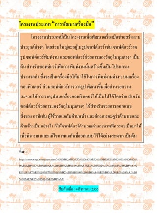 โครงงานประเภทนี้เป็นโครงงานเพื่อพัฒนาเครื่องมือช่วยสร้างงาน ประยุกต์ต่างๆ โดยส่วนใหญ่จะอยู่ในรูปซอฟต์แวร์ เช่น ซอฟต์แวร์วาด รูป ซอฟต์แวร์พิมพ์งาน และซอฟต์แวร์ช่วยการมองวัตถุในมุมต่างๆ เป็น ต้น สาหรับซอฟต์แวร์เพื่อการพิมพ์งานนั้นสร้างขึ้นเป็นโปรแกรม ประมวลคา ซึ่งจะเป็นเครื่องมือให้เราใช้ในการพิมพ์งานต่างๆ บนเครื่อง คอมพิวเตอร์ ส่วนซอฟต์แวร์การวาดรูป พัฒนาขึ้นเพื่ออานวยความ สะดวกให้การวาดรูปบนเครื่องคอมพิวเตอร์ให้เป็นไปได้โดยง่าย สาหรับ ซอฟต์แวร์ช่วยการมองวัตถุในมุมต่างๆ ใช้สาหรับช่วยการออกแบบ สิ่งของ อาทิเช่น ผู้ใช้วาดแจกันด้านหน้า และต้องการจะดูว่าด้านบนและ ด้านข้างเป็นอย่างไร ก็ให้ซอฟต์แวร์คานวณค่าและภาพที่ควรจะเป็นมาให้ เพื่อพิจารณาและแก้ไขภาพแจกันที่ออกแบบไว้ได้อย่างสะดวก เป็นต้น ที่มา : http://krumewstp.wordpress.com/%E0%B8%9B%E0%B8%A3%E0%B8%B0%E0%B9%80%E0%B8%A 0%E0%B8%97%E0%B8%82%E0%B8%AD%E0%B8%87%E0%B9%82%E0%B8%84%E0%B8%A3% E0%B8%87%E0%B8%87%E0%B8%B2%E0%B8%99%E0%B8%84%E0%B8%AD%E0%B8%A1%E0 %B8%9E%E0%B8%B4%E0%B8%A7/ สืบค้นเมื่อ 14 สิงหาคม 2555