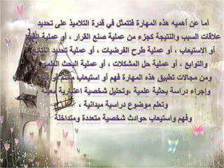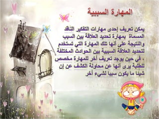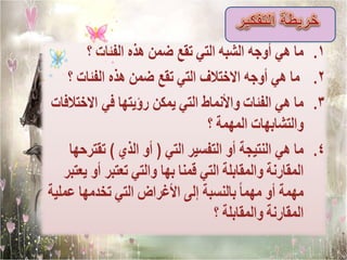 تناقش الوثيقة أهمية مهارات التفكير النقدي والإبداعي في مواجهة تحديات الحياة، وضرورة توسيع الإدراك لفهم الأمور بوضوح. كما تتناول أهمية مهارة المقارنة في تحليل المشكلات وتحديد الحلول بشكل فعال، وتوضح خطوات حل المشكلات بدءًا من التعريف وصولاً إلى وضع خطة العمل.