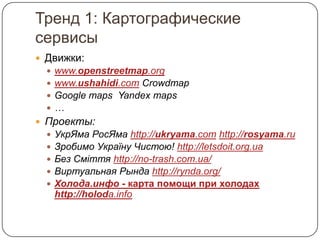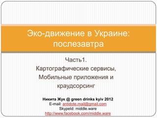 Документ обсуждает эко-движение в Украине, акцентируя внимание на картографических сервисах, мобильных приложениях и краудсорсинге. Он перечисляет различные онлайн-платформы и проекты, направленные на улучшение экологической ситуации в стране. Также поднимаются вопросы недостатка координации и возможности создания сообществ для обмена опытом и информации.
