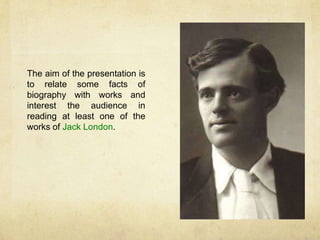The document provides biographical information about author Jack London and summarizes some of his major works. It notes that London drew from his life experiences, including working as an oyster pirate and sailor, prospecting in Alaska during the Gold Rush, and later being a war correspondent. Some of his most famous works inspired by these experiences include The Sea-Wolf, Martin Eden, White Fang, and other short stories about the Alaska gold prospecting era. The document recommends reading some of London's novels and stories to get a sense of his writing inspired by his adventurous and widely traveled life.