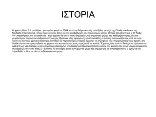 συνεδρια με τον τιτλο web2.0 Summit. Τα συνεδρια αυτα συνεχιζονται μεχρι και σημερα για να αποσαφηνηστει ο ορος και να