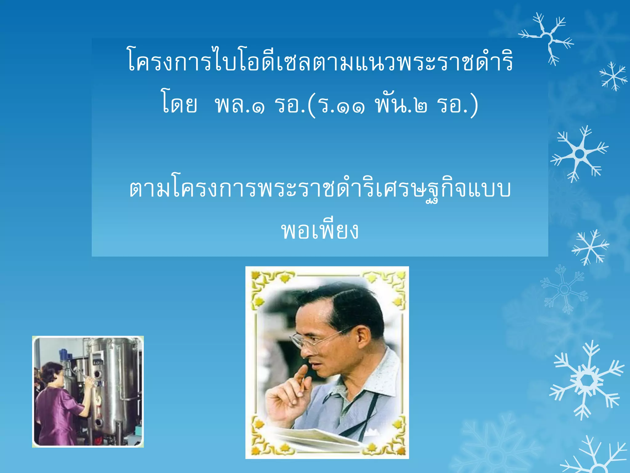 ิ นับเป็ นความโชคดีของประชาชนชาวไทย พระบาทสมเด็จพระเจ้าอยูหัว ทรงมีสาย ่ พระเนตรยาวไกล ทรงเห็นประโยชน์ของพลังงานทดแทนจากพืช พระองค์ทรงริเริ่ม ให้มการวิจยทดลอง ผลิตและใช้พลังงานทดแทนจากพืช ทังเอทานอลที่ใช้ผสมนามัน ี ั ้ ้ แก๊สโซฮอล์ รวมทังการผลิตไบโอดีเซลจากนามันพืชใช้แล้วโดยนามาจากห้องเครื่อง ้ ้ ในวัง นามาผลิตในโครงการส่วนพระองค์ สวนจิตรลดา มานานกว่า ๒๐ ปี พระบาทสมเด็จพระเจ้าอยูหัว ทรงเห็นความสาคัญของนามันจากพืช ไบโอดีเซล ่ ้ อย่างต่อเนือง และขยายผลไปสูภาคชนบท โดยในปี พ.ศ. ๒๕๒๘ พระบาทสมเด็จพระ ่ ่ เจ้าอยูหัวทรง มีพระราชดาริให้ มหาวิทยาลัยสงขลา นครินทร์ สร้างโรงงานสกัด ่ นามันปาล์ม ณ สหกรณ์นคมอ่าวลึก จ.กระบี่ เนืองจากเป็ นแหล่งปลูกปาล์มนามัน ้ ิ ่ ้ จานวนมาก และทรงพระกรุณาโปรดเกล้าฯ ให้สร้าง โรงงานสกัดนามันปาล์ม ้ บริสทธิ์ขนาดเล็กมีกาลังผลิตวันละ ๑๑๐ ลิตร ณ ศูนย์การศึกษาพัฒนาพิกลทอง ุ ุ อันเนืองมาจากพระราชดาริ จ.นราธิวาส ่