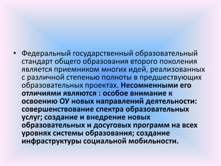 Документ описывает федеральный государственный образовательный стандарт (ФГОС) второго поколения, который акцентирует внимание на качестве образования и социальной мобильности, а также внедрении внеурочной деятельности в образовательный процесс. Подчеркивается значимость дополнительного образования для развития творческих способностей детей и формирования условий для социализации. Представлены различные модели организации внеурочной деятельности и дополнительного образования, которые охватывают широкие аспекты инициатив в образовательных учреждениях.