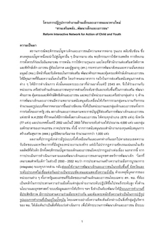 ู “สานเสริ มพลัง...พัฒนาเด็กและเยาวชน” Reform Interactive Network for Action of Child and Youth ความเป็ นมา ั สถานการณ์ พฤติก รรมป ญหาเด็ก และเยาวชนมีความหลากหลาย รุน แรง สลับ ซับ ซ้อ น ซึ่ง ั ่ ั สาเหตุของปญหาหนึ่งจะนาไปสูปญหาอืน ๆ อีกมากมาย เช่น พฤติกรรมการใช้สารเสพติด การติด เกม ่ การตังครรภ์กอนวัยอันเหมาะสม การพนัน การใช้ความรุนแรง และโดยที่สานักงานส่งเสริมสวัสดิภาพ ้ ่ และพิทกษ์เด็ก เยาวชน ผู้ด้อยโอกาส และผู้สงอายุ (สท.) กระทรวงการพัฒนาสังคมและความมันคงของ ั ู ่ มนุษย์ (พม.) มีหน้าทีและรับผิดชอบในการส่งเสริม พัฒนาศักยภาพและคุ้มครองพิทกษ์เด็กและเยาวชน ่ ั ให้มคณภาพทีดและความมันคงในชีวต โดยกาหนดมาตรการ กลไกในการส่งเสริมสนับสนุ นภาคส่วน ีุ ่ ี ่ ิ ต่า ง ๆ ให้ม ีก ารด าเนิ น การ ดัง นั ้น ตลอดระยะเวลาที่ผ่ า นมาตัง แต่ ปี 2545 สท. จึง ได้ ร่ว มงานกับ ้ หน่วยงาน เครือข่ายด้านเด็กและเยาวชนทุกภาคส่วนทังระดับชาติและระดับพื้นที่ใ นการส่งเสริม พัฒนา ้ ศักยภาพ คุมครองและพิทกษ์สทธิเด็กและเยาวชน และพบว่ามีหน่ วยงานและเครือข่ายกลุ่มต่าง ๆ ด้าน ้ ั ิ การพัฒนาเด็กและเยาวชนมีความพยายามสนับสนุ นขับเคลื่อนให้เ กิด การรวมกลุ่มคน /งาน/กิจกรรม จานวนและรูปแบบทีหลากหลายมากขึนอย่างชัดเจน ทังทีเป็นหน่วยงานและกลุ่มเด็กและเยาวชนทังจาก ่ ้ ้ ่ ้ การก่อตังของภาครัฐ เช่น สภาเด็กและเยาวชนตามพระราชบัญญัติส่งเสริมการพัฒนาเด็กและเยาวชน ้ แห่งชาติ พ.ศ.2550 ทีกาหนดให้มการจัดตังสภาเด็กและเยาวชน ให้ครบทุกอาเภอ (878 แห่ง) จังหวัด ่ ี ้ (77 แห่ง) และประเทศตังแต่ปี 2552 และในปี 2553 ได้ขยายระดับตาบลได้ประมาณ 4,000 แห่ง และกลุ่ม ้ องค์กรอาสาของภาคเอกชน ภาคประชาชน ทังนี้ จากการสนับสนุ นของสานักงานกองทุนสนับสนุ นการ ้ สร้างเสริมสุขภาพ (สสส.) มูลนิธสยามกัมมาจล จานวนมากกว่า 1,000 แห่ง ิ ผลงานที่ปรากฏดังกล่ าวมีรูปแบบทังที่เหมือนกัน และแตกต่ างกัน ออกไปตามขอบเขตความ ้ รับ ผิด ชอบและทรัพ ยากรที่ม ีอยู่ ของหน่ วยงาน/องค์กร แต่ ยัง ไม่ป รากฏความชัด เจนแน่ น อนในเชิง ่ี ั ้ ั ผลลัพธ์ทตวเด็ก อีกทังพฤติกรรมปญหาของเด็กและเยาวชนยังคงปรากฏอย่างต่อเนื่อง นอกจากนี้ จาก การประเมิน การด าเนิ น งานตามแผนพัฒนาเด็กและเยาวชนตามยุ ทธศาสตร์ก ารพัฒนาเด็ก “โลกที่ เหมาะสมสาหรับเด็ก” ในช่วงปี 2550 - 2552 พบว่า การประสานงานสร้างความร่วมมือการบูรณาการ (integrate) ของทุกภาคส่วน กลับ ส่งผลให้ง านการพัฒ นาเด็กและเยาวชนในระดับพื้นที่ จังหวัด และ ระดับประเทศไม่เ ชื่อมต่ อกัน อย่างเป็ น ระบบชัด เจนและแสดงถึง ความยังยืน ด้วยเหตุน้ี บุคลากรของ ่ หน่วยงานต่าง ๆ ทัง