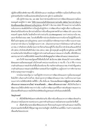 น ั ิ ่ ี ้ ี ่ ิ รูปธรรมพร้อมรับการเปลี่ยนแปลงของสังคมในประเทศ ภูมภาค และสังคมโลก ิ อนึ่ง ผู้บริหารของ พม. และ สสส. โดยการนาของปลัดกระทรวงการพัฒนาสังคมและความมันคง ่ ของมนุษย์ และผู้จด การ สสส. ได้มการลงนามบันทึกข้อตกลงความร่วมมือ (MOU) ในการด าเนินการ ั ี ขับเคลื่อนและพัฒนาสังคมอย่างเป็ น รูปธรรม เมื่อวันที่ 7 ธันวาคม 2553 ที่กาหนดว่าความร่วมมือใน ระดับกระทรวง ส่งเสริมให้เกิด การเรียนรู้ระดับผู้บริหาร การพัฒนาศักยภาพผู้นาเพื่อการเปลี่ยนแปลง สังคมร่วมกันในระดับกรม มีความร่วมมือในการขับเคลื่อนยุทธศาสตร์ด้านการพัฒนาเด็ก และเยาวชน ครอบครัว ชุมชน ท้องถิน โดยมีกลไกการทางานร่ว มกัน (Co-Management) ระหว่างหน่ วยงานใน พม. ่ และภาคีเครือข่ายของ สสส. ในระดับพื้นที่มการนาประเด็นข้อตกลงจากระดับกรมไปปฏิบัติใ นระดับ ี พื้นที่ (อปท./ชุมชน) อย่างเป็ น รูปธรรม และความร่วมมือในการจัด คณะกรรมการเพื่อวางแนวทางและ ประสานการด าเนิ น งาน โดยมีผู้อานวยการ สท. เป็ นประธานกรรมการรับผิด ชอบงานด้า นเด็กและ เยาวชน ภารกิจดังกล่าวเป็นทีมาของการหารือร่วมกันของผู้ท่เกี่ยวข้องทังจากสานักส่งเสริมและพิทกษ์ ่ ี ้ ั เด็ก (สทด.) สานักส่งเสริมพิทกษ์เยาวชน (สทย.) สสส. ผู้ทรงคุณวุฒ ิ และผู้เชี่ยวชาญพิเศษ และได้ม ี ั ความเห็นร่วมกันว่าต้องมีโครงการปฏิรปการทางานด้านเด็กและเยาวชนแนวทางใหม่ข้น เพื่อให้มระบบ ู ึ ี และกระบวนการทางานทีมประสิทธิภาพและเกิดประสิทธิผลสูงสุดในการพัฒนาเด็กและเยาวชนของประเทศ ่ ี อย่างไรก็ด ี ต่ อมาคณะรัฐมนตรีไ ด้มมติเมื่อวันที่ 28 มีนาคม 2554 เห็นชอบให้ กระทรวงพัฒนา ี สังคมและความมันคงของมนุ ษย์ ปรับโครงสร้างหน่ วยงานระดับกรม 5 กรม ซึ่ง 1 ใน 5 ก็คอ การรวม ่ ื งานด้านเด็กและเยาวชนเข้าด้วยกันขึนเป็นระดับกรม คือ กรมกิจการเด็กและเยาวชน ทาหน้ าที่ดูแลส่วน ้ งานด้านเด็กและเยาวชนอย่างเต็มทีเพื่อความคล่องตัวในการปฏิบตงาน (อยู่ในระหว่างการพิจารณาของ ่ ั ิ สานักงานคณะกรรมการกฤษฎีกา) จากนโยบายของรัฐ บาล รวมทังผู้บริหารกระทรวงการพัฒนาสังคมและความมันคงของมนุ ษย์ ้ ่ จึงนับได้วา เป็นความท้าทายที่ สท. ต้องหาแนวทางการพัฒนาเด็กและเยาวชน รวมทังกระบวนการและ ่ ้ ระบบการทางานให้มประสิทธิภาพทีดยง ๆ ขึน ดังนั น สท. จึงขอเสนอโครงการปฏิ รูปการทางานด้ าน ี ่ ี ิ่ ้ ้ เด็กและเยาวชนแนวทางใหม่ “สานเสริ ม พลัง ... พัฒนาเด็กและเยาวชน” เพื่อ ให้เ กิด เป็ นการ พัฒนาระบบให้มประสิทธิภ าพมากกว่าเดิม รวมถึงการพัฒนายุทธวิธใ นการส่งเสริมสุขภาพและความ ี ี มันคงของชีวตเด็กและเยาวชนให้