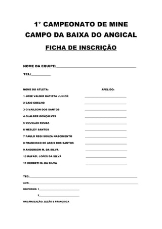 This document is a registration form for the 1st Campeonato de Mine tournament to be held at Campo da Baixa do Angical. It requests the name of the team, contact phone number, names and nicknames of up to 11 players on the team, the names of the coach and assistant, and a description of the team uniforms. The tournament is being organized by Zezão and Francisca.