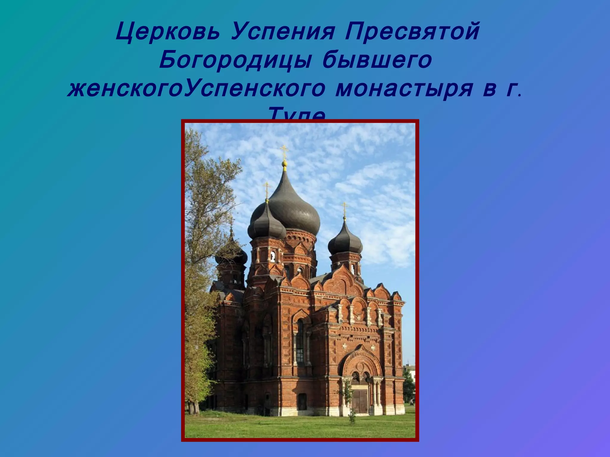 Церковь Успения Пресвятой Богородицы в Туле имеет богатую историю, начиная с первого каменного храма, построенного в XVIII веке, который был многократно восстановлен и расширен. В 1898 году старое здание было разобрано и возведён новый двухэтажный храм, освящённый в 1902 году, с уникальными росписями, которые могут быть копиями работ Виктора Васнецова. После закрытия в 1922 году, храм был возвращён верующим в 2006 году и с тех пор служит кафедральным собором.