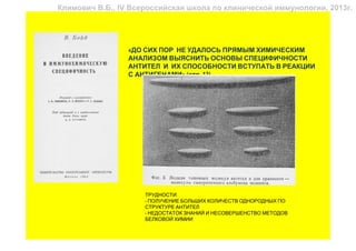 Документ содержит материалы IV Всероссийской школы по клинической иммунологии, проведенной в 2013 году, фокусируясь на иммуноглобулинах и их химической структуре. Обсуждаются трудности в получении антител и значимость структурных исследований, приведенных в работах известных ученых, таких как Родуни Р. Портер и Джеральд М. Эделман. Также рассмотрены функции молекул клеточной адгезии и их связь с нервной системой и иммунной реакцией.