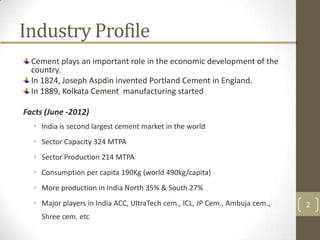 UltraTech Cement Ltd. operates a cement plant called Rajashree Cement Works in Malkhed, India. The plant started with a capacity of 0.5 million tonnes per year and has since expanded to 4.7 million tonnes per year. It manufactures Portland cement and has a 58.2 megawatt thermal power plant. The plant owns one of the largest limestone mines in India. UltraTech Cement is India's largest cement company with an annual capacity of over 110 million tonnes. It has various cement brands and operates across India.
