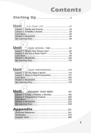 The document is a textbook for 8th grade English students in Ukraine. It contains 4 units that cover topics like family and friends, health, school, preferences, and geography. Each unit includes vocabulary lessons, grammar lessons on verb tenses, reading passages, and exercises. The textbook also has sections in the back for grammar and vocabulary references.