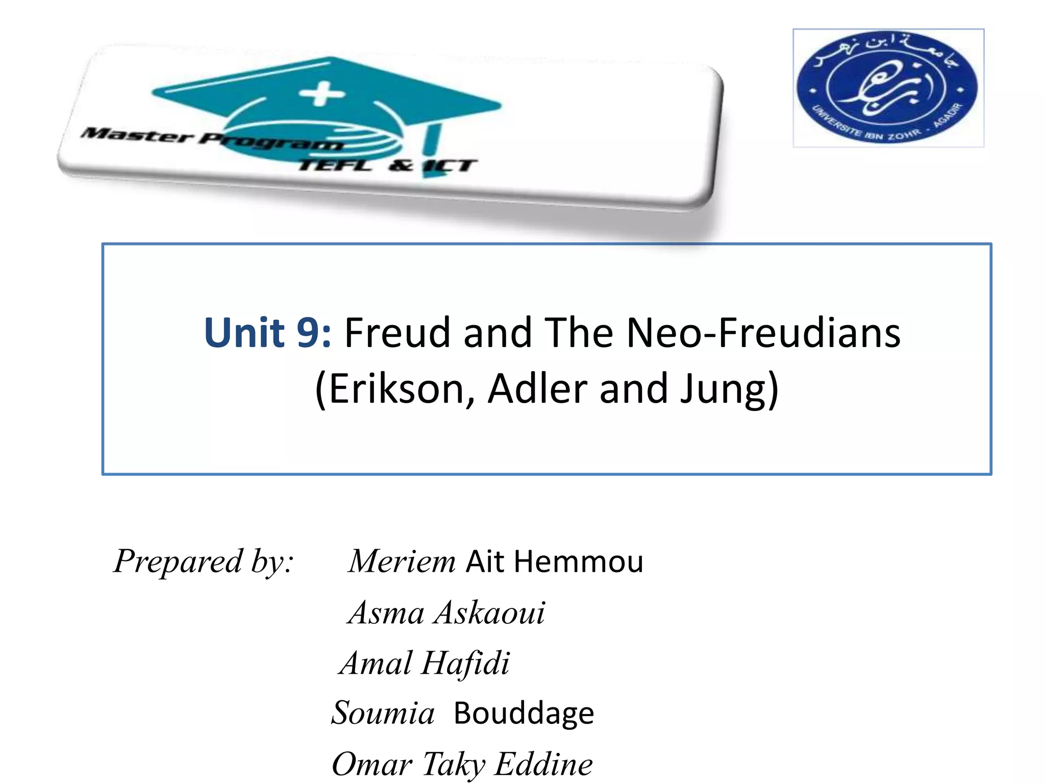 The document outlines Erik Erikson's psychosocial theory of development, which proposes that personality develops through 8 stages of psychosocial challenges from infancy to late adulthood. Each stage focuses on developing trust, autonomy, initiative, industry, identity, intimacy, generativity, and integrity. If the challenges of each stage are successfully negotiated, it allows for healthy development into the next stage.
