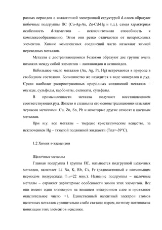 Документ описывает химию металлов, включая классификацию и свойства s-, p-, d- и f-металлов, а также характеристики щелочных и щелочноземельных металлов. Основное внимание уделяется их химическим свойствам, реакциям с неметаллами и применению в промышленности. Приведены таблицы с физическими и химическими свойствами различных металлов.