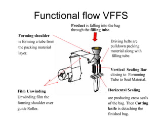 The document describes different types of bag styles and filling applications that can be used on VFFS packaging machines. It discusses pillow bags, gusseted bags, sachet bags, and multipacks. It also covers different filling methods like multihead weighers, linear weighers, auger fillers, and cup fillers. Finally, it lists various wrapping materials commonly used for these vertical form fill and seal machines like polyethylene, polypropylene, oriented polypropylene, and paper laminates.