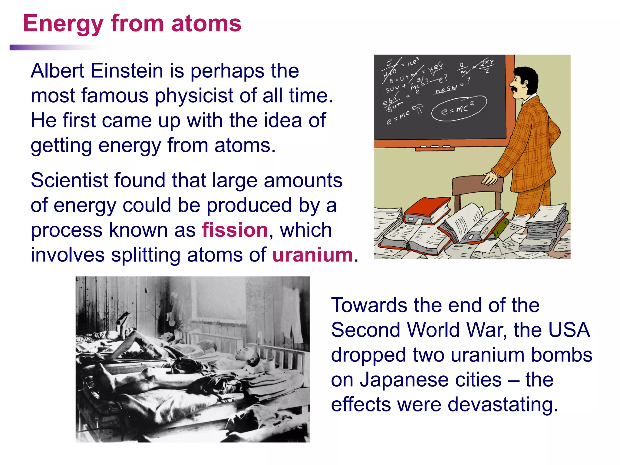 Albert Einstein first came up with the idea of getting energy from atoms. Scientists found that large amounts of energy could be produced through the process of nuclear fission, which involves splitting atoms of uranium. There are two ways to release the huge amounts of energy contained within atoms: nuclear fission, which is splitting atomic nuclei, and nuclear fusion, which is joining atomic nuclei together. Einstein connected energy and matter through his famous equation E=mc2, which showed that a small amount of matter can release a huge amount of energy.