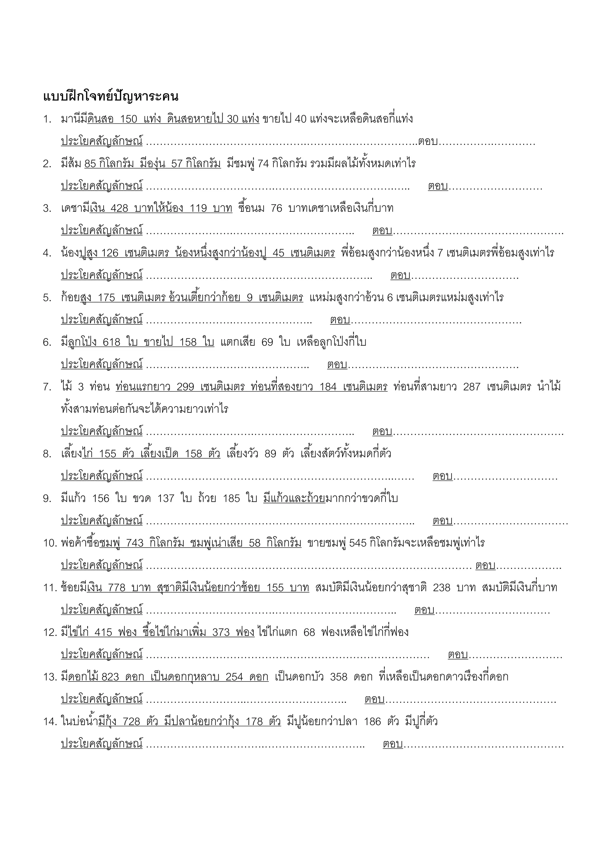 า 2 คู่ ราคาคูละ 37 บาท ซื ้อหนังสือ 45 บาท ซื ้อของไปทังหมดกี่บาท ่ ้ ประโยคสัญลักษณ์ ……………………………… ตอบ………………………………… 75. มีชมพู่ 49 ผล ให้ น้องไป 7 ผล แล้ วนาชมพูที่เหลือมาแบ่งใส่จาน จานละ 6 ผล จะได้ ทงหมดกี่จาน ่ ั้ ประโยคสัญลักษณ์ ……………………………… ตอบ………………………………… 76. แม่มีเงิน 72 บาท แบ่งให้ ลก 8 คน คนละเท่า ๆ กัน พ่อให้ เงินลูกแต่ละคนเพิ่มคนละ 3 บาท ลูกจะได้ เงินคนละกี่บาท ู ประโยคสัญลักษณ์ ……………………………… ตอบ………………………………… 77. สมุด หนังสือ กระเป๋ าราคารวมกัน 475 บาท ถ้ ากระเป๋ าราคา 217 บาท สมุดราคา 194 บาท หนังสือราคากี่บาท ประโยคสัญลักษณ์ ……………………………… ตอบ………………………………… 78. ฉันซื ้อกล่องใส่ดนสอ 2 อัน อันละ 18 บาท ซื ้อพูกน 3 อัน อันละ 8 บาท ฉันซื ้อกล่องดินสอแพงกว่าพูกนกี่บาท ิ ่ ั ่ ั ประโยคสัญลักษณ์ …………………………………………... ตอบ………………………………… 79. เสื ้อราคาตัวละ 75 บาท ซื ้อ 4 ตัว จ่ายเงินให้ พอค้ า 290 บาทพ่อค้ าลดให้ กี่บาท ่ ประโยคสัญลักษณ์ …………………………………………... ตอบ………………………………… 80. ขายเป็ ด 18 ตัวราคาตัวละ 40 บาท นาเงินไป ซื ้อสมุด 15 เล่มราคาเล่มละ 9 บาทจะเหลือเงินกี่บาท ประโยคสัญลักษณ์ …………………………………………... ตอบ………………………………… 81. มีสมุด 75 เล่ม ซื ้อมาอีก 8 โหล จะมีสมุดทังหมดกี่เล่ม ้ ประโยคสัญลักษณ์ …………………………………………... ตอบ………………………………… 82. ดอกกุหลาบ 14 ห่อ ๆ ละ 20 ดอก ขายไปดอกละ 5 บาทจะได้ เงินทังหมดเท่าไร ้ ประโยคสัญลักษณ์ …………………………………………... ตอบ………………………………… 83. มะพร้ าวหนึงทะลายมี 9 ผล มีมะพร้ าว 150 ทะลาย ขายมะพร้ าวผลละ 5 บาท จะได้ เงินเท่าไร ่ ประโยคสัญลักษณ์ …………………………………………... ตอบ………………………………… 84. มีปลาทู 125 ตัว จัดใส่เข่ง ๆ ละ 5 ตัว ขายไป 8 เข่ง จะเหลือปลาทูกี่เข่ง ประโยคสัญลักษณ์ …………………………………………... ตอบ………………………………… 85. มีน ้าตาลทราย 480 กิโลกรัม แบ่งใส่ถง ๆ ละ 4 กิโลกรัม ขายถุงละ 25 บาทจะได้ เงินทังหมดเท่าไร ุ ้ ประโยคสัญลักษณ์ …………………………………………... ตอบ………………………………… 86. พ่อมีเงิน 840 บาท ซื ้อของใช้ 540 บาท เงินที่เหลือแบ่งให้ ลก 4 คน เท่า ๆ กัน ลูกจะได้ รับเงินคนละเท่าไร ู ประโยคสัญลักษณ์ …………………………………………... ตอบ………………………………… 87. ธนบัตรใบละ 50 บาท 6 ใบ มีคามากกว่า ธนบัตรใบละ 20 บาท 6 ใบ อยูกี่บาท ่ ่ ประโยคสัญลักษณ์ …………………………………………... ตอบ………………………………… 88. สมุด 45 โหล ขายไป 145 เล่มจะเหลือสมุดกี่เล่ม ประโยคสัญลักษณ์ …………………………………………... ตอบ…………………………………