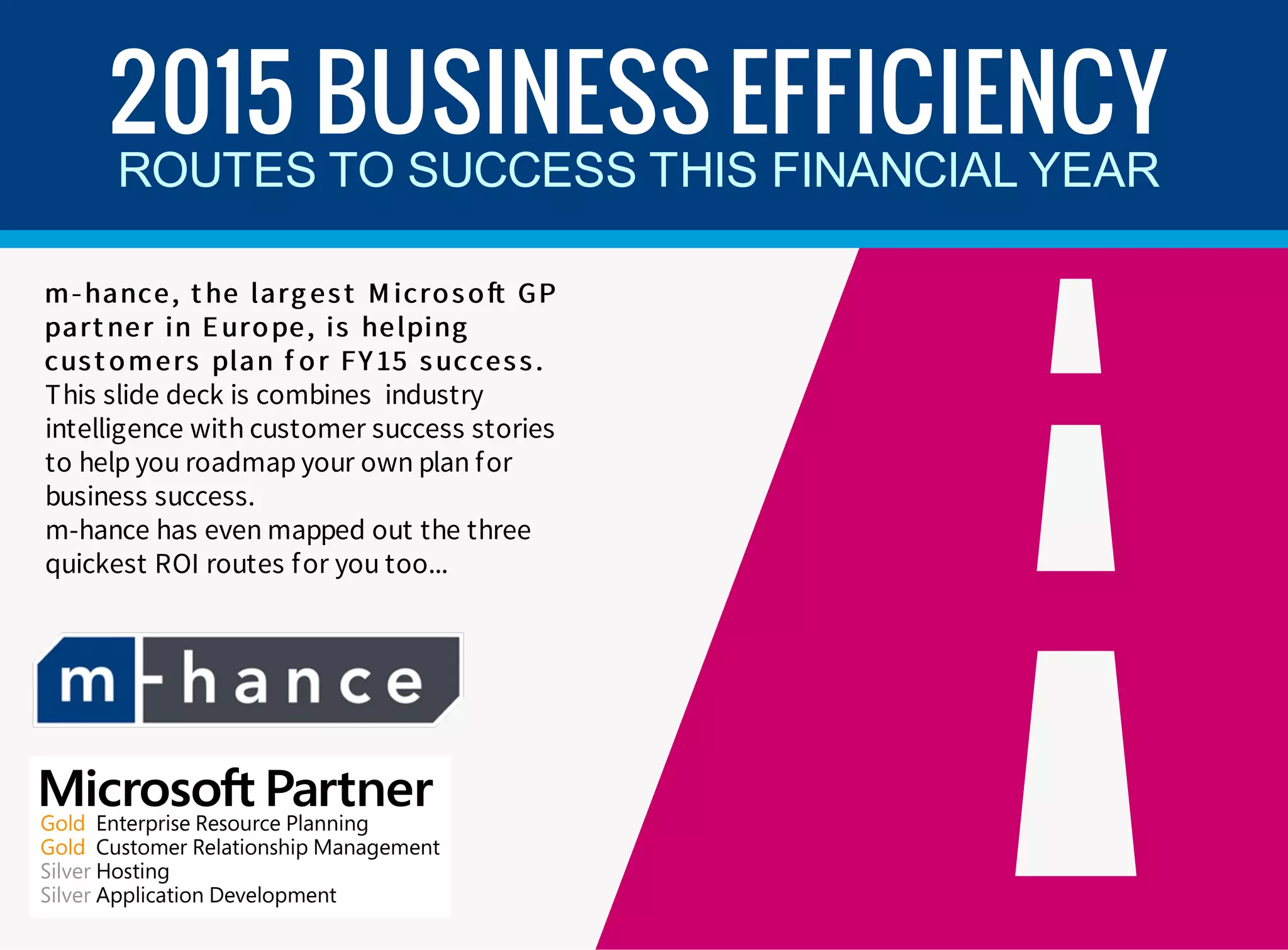 The document outlines strategies for business efficiency in 2015, focusing on three key routes for achieving success: upgrading to Microsoft Dynamics GP 2015, adopting cloud solutions, and exploring enhancements that drive efficiency. It emphasizes the importance of timely upgrades and offers statistics on potential savings and improved decision-making. The company m-hance, as Europe's largest Microsoft partner, aims to aid customers in optimizing their operations and realizing cost savings.