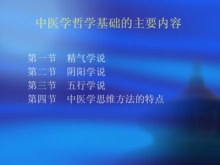 本课程电子讲稿探讨了中医学的哲学基础,特别是阴阳学说的核心概念和应用。阴阳学说以其对立、互根互用、交感与互藏等特性解释自然界及人体生命的变化与平衡。文中强调阴阳属性的相对性和绝对性,表明阴阳之间的关系对健康和疾病的影响。