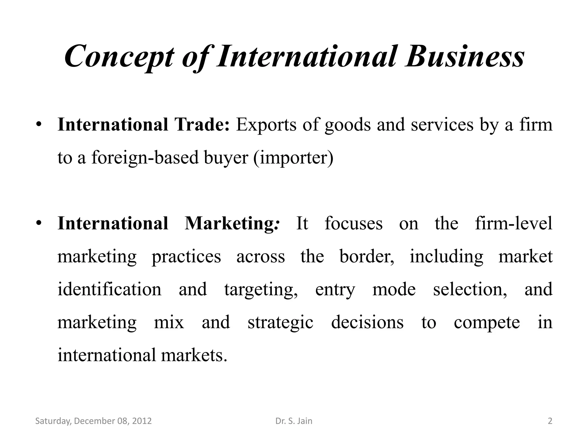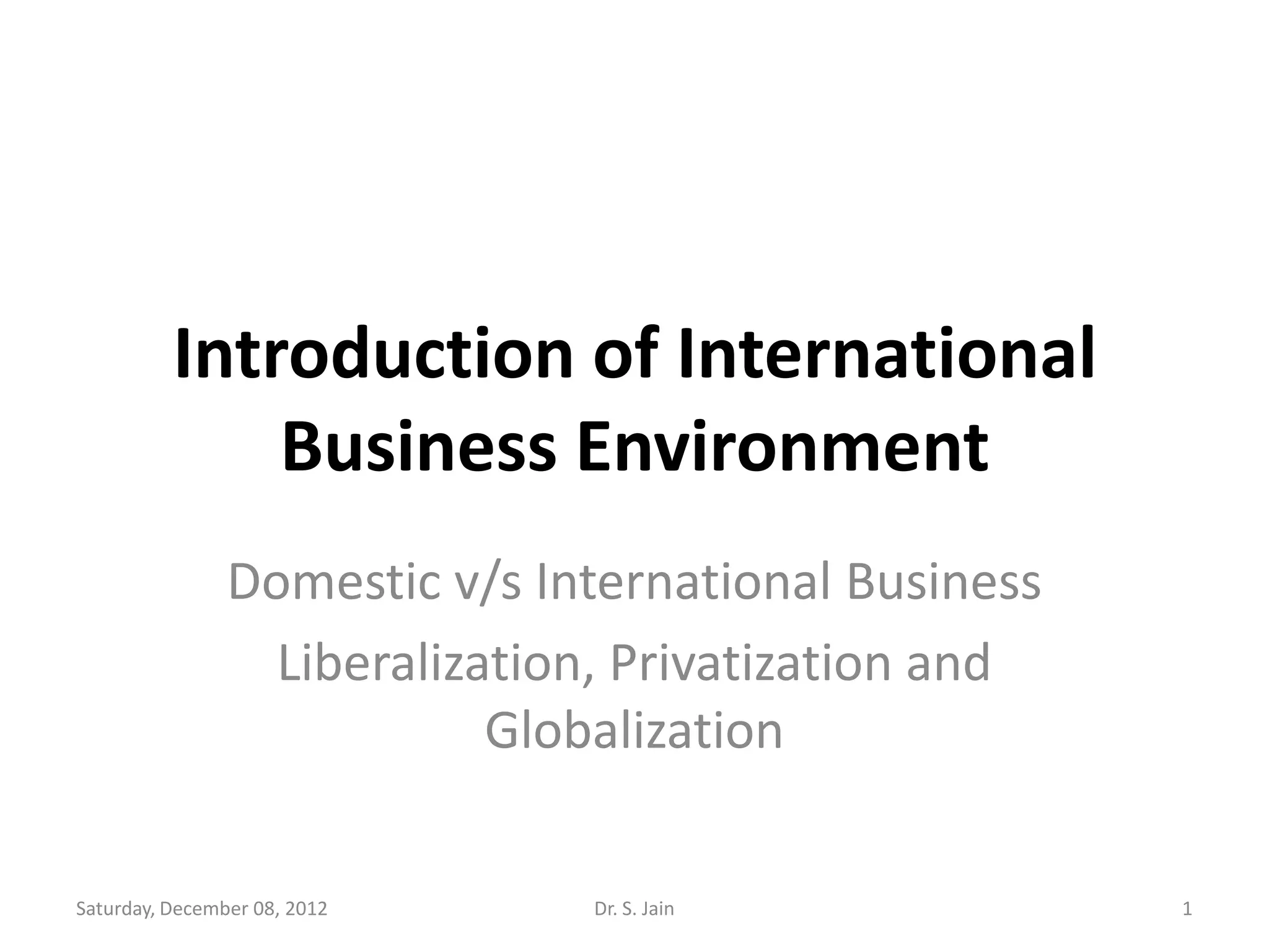 The document discusses key concepts related to international business environments including domestic versus international business, liberalization, privatization, and globalization. It provides definitions and explanations of international business, international trade, international marketing, international investments, and global business. It also compares differences between domestic and international business environments and discusses reasons for international business expansion.