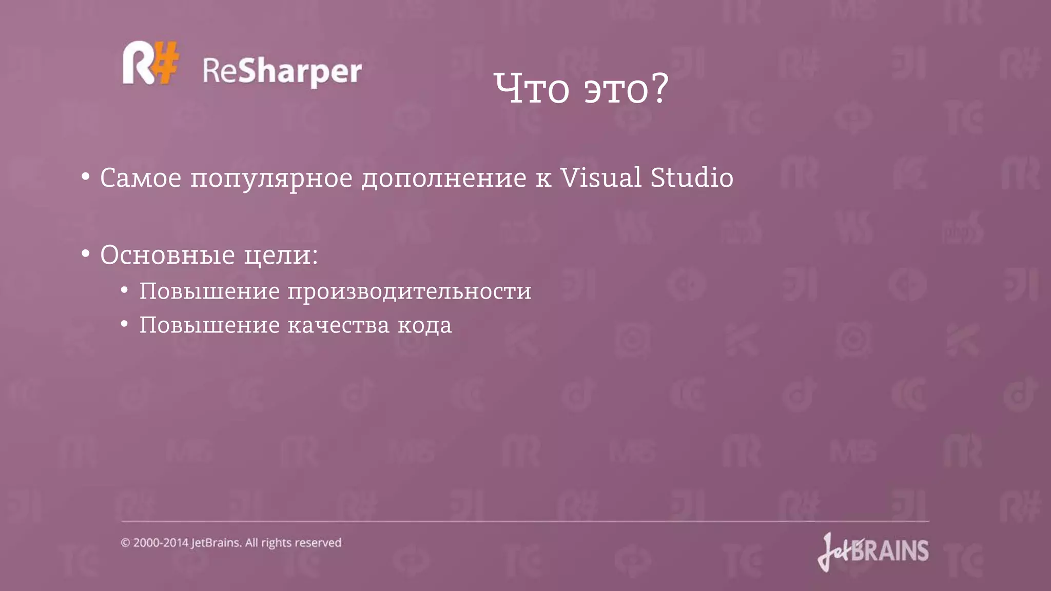 Документ описывает ReSharper, популярное дополнение к Visual Studio, предназначенное для повышения производительности и качества кода с помощью непрерывного анализа, рефакторинга и автоматизации рутинных задач. В новой версии R#9 добавлена поддержка C++ и новых функций C#6, а также улучшены инструменты для веб-разработки и анализа зависимостей. Также предлагается бесплатная триал-версия и ресурсы для обучения на официальном сайте JetBrains.