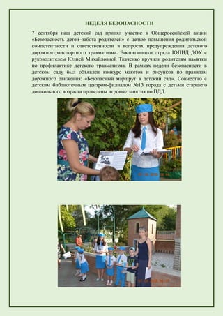 В сентябре 2015 года детский сад принял участие в акции «безопасность детей–забота родителей», направленной на повышение родительской ответственности в области предупреждения детского травматизма. В рамках недели безопасности дети провели конкурсы и игровые занятия по правилам дорожного движения, а также организовали акцию «автокресло – детям», призывая родителей к правильной перевозке детей в автомобилях. Комиссия «за безопасность движения» работала над воспитанием культуры поведения на дорогах среди дошкольников и их родителей.