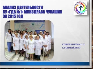 Документ предоставляет анализ деятельности городской детской больницы №1 Минздрава Чувашии за 2015 год, включая информацию о структуре, оказываемых медицинских услугах и численности населения, обслуживаемого учреждением. В 2015 году больница провела 100% диспансеризации несовершеннолетних и активизировала работу подросткового центра. Также описаны достижения учреждения, включая награды и почетные звания сотрудников.