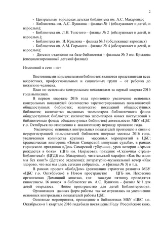 Документ представляет отчет о деятельности библиотек МБУ «ЦБС г.о. Октябрьск» за первый квартал 2016 года, отражая увеличение основных контрольных показателей по сравнению с аналогичным периодом 2015 года. Записались более 8000 пользователей, зафиксировано увеличение посещений и выдачи книг, что связано с проведением массовых мероприятий и активной работой с читателями. В течение квартала было организовано множество мероприятий, направленных на поддержку чтения, краеведение и патриотическое воспитание, с участием различных возрастных групп населения.