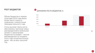 В первом полугодии 2016 года объем бюджетов на мобильную рекламу в Украине вырос более чем в 4 раза по сравнению с предыдущим годом, с наибольшими расходами от рекламодателей в категории FMCG. Абсолютным лидером по популярности форматов стали floating форматы, а наилучший отклик получала реклама, направленная на формирование спонтанного спроса. Ожидается, что во втором полугодии мобильная аудитория продолжит расти, а активность рекламодателей в мобильном сегменте значительно увеличится.