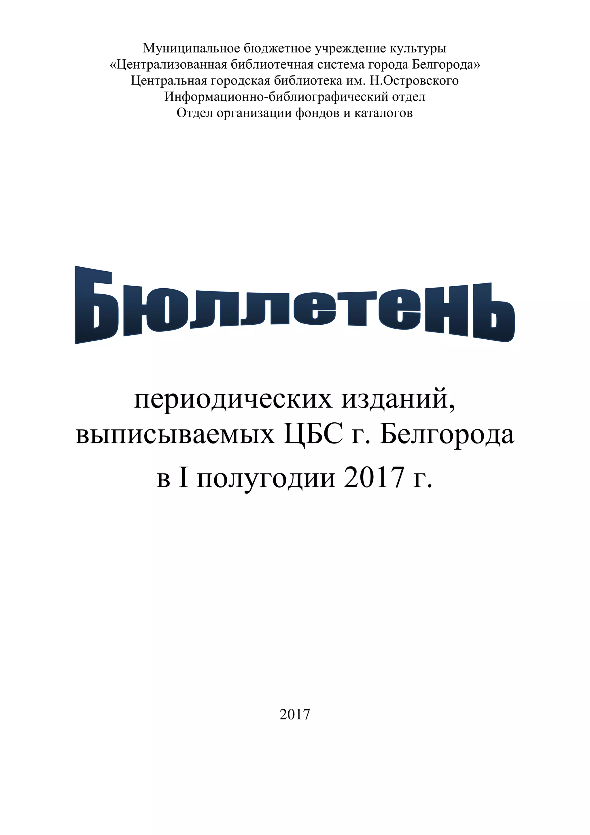 Данный документ представляет собой бюллетень периодических изданий, выписываемых Центральной библиотечной системой города Белгорода в первом полугодии 2017 года. В нем содержится перечень газет и журналов, организованных по структурным подразделениям библиотеки. Также перечислены условные обозначения для различных категорий библиотек и отделов.
