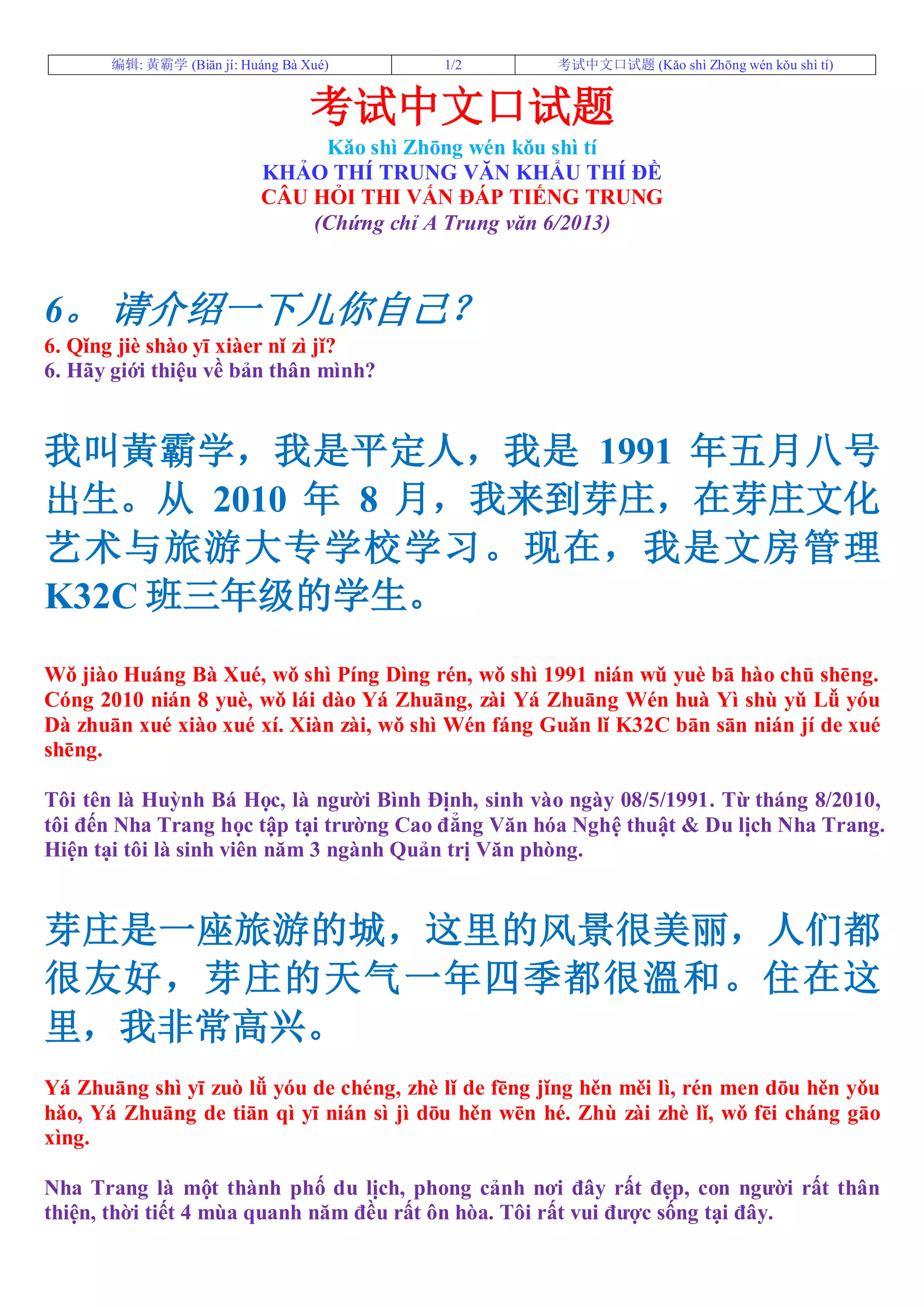 Tài liệu là một bài phỏng vấn bằng tiếng Trung của một sinh viên tên là Huỳnh Bá Học, người Bình Định, hiện đang học tại Nha Trang. Anh chia sẻ về cuộc sống, bạn bè và các hoạt động hàng ngày của mình trong bối cảnh học tập bận rộn. Huỳnh mong muốn tìm được một công việc ổn định sau khi tốt nghiệp.