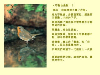 文章讨论了父母应给予子女独立思考和选择的空间,以培养他们的创造力和责任感。通过实例,作者强调教育不应过度干预孩子的生活,鼓励他们自我决策和面对挑战,从而成长为真正独立的人。最终,独立性和自我负责是每个人必须学习的重要课题。