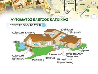 Οι λύσεις μαςκαλύπτουν ΟΛΕΣ τις ανάγκες ενός σπιτιού Συναγερμός / ενεργητική ασφάλεια Έλεγχος θερμοκρασίας Έλεγχος φωτισμού και συσκευών Κεντρική διανομή ήχου / εικόνας Κάμερες παρακολούθησης Δίκτυο υπολογιστών / τηλεφωνίας Έλεγχος του σπιτιού από το τηλέφωνο, το Διαδίκτυο και από ένα τηλεχειριστήριο Το όλο σύστημα λειτουργεί ως ενιαίο σύνολο