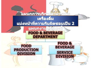 This document outlines the organization of a food and beverage department including two main divisions: food production and food and beverage service. It also lists different types of table and self-service and qualities needed by waitstaff like good memory, handwriting, and cooperation. Various tools and equipment for food and beverage service are also identified such as china ware, glassware, silverware, tables, and bar equipment.