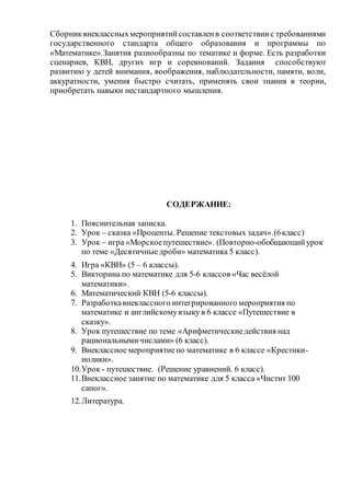 Сборник разработок внеклассных мероприятий по математике для 5-6 классов включает разнообразные задания, игры и сценарии, направленные на развитие математических навыков учащихся и поддержание интереса к предмету. Документ описывает цели и содержание мероприятий, охватывающих темы, такие как проценты и десятичные дроби, и предлагает практические упражнения и задачи для обобщения и закрепления знаний. Каждый урок включает элементы творчества и игры, что способствует формированию у школьников навыков нестандартного мышления и командной работы.