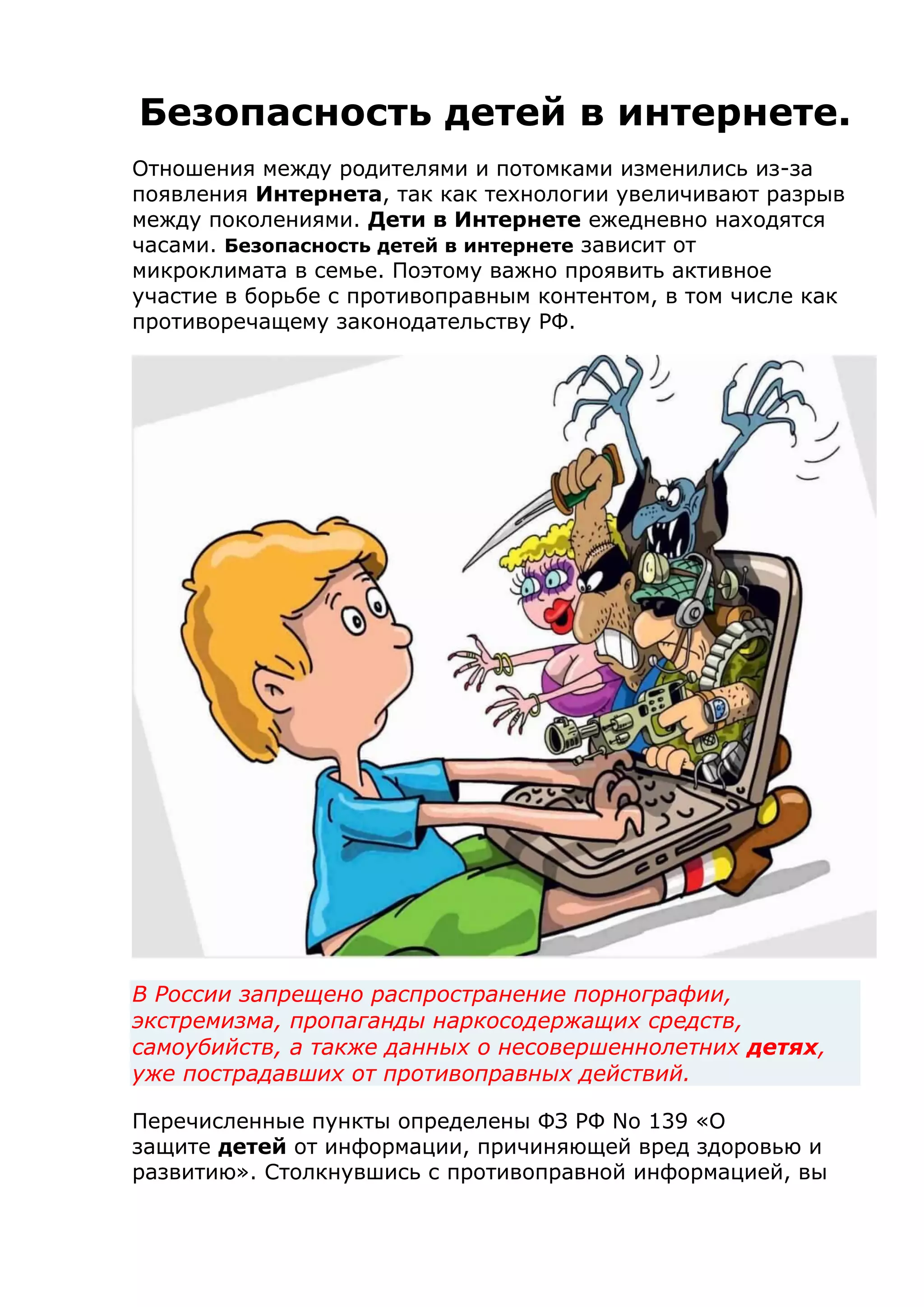 Документ описывает важность безопасности детей в интернете и методы защиты от мошенничества, негативного контента и технических угроз. Основное внимание уделяется взаимодействию родителей с детьми, чтобы создать доверительные отношения, которые помогут избежать рисков. Также представлены рекомендации по контролю доступа к интернету и обучению детей правилам безопасного поведения в сети.