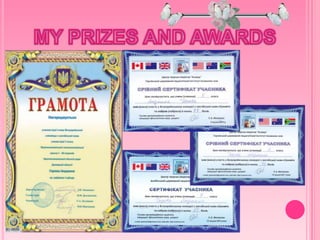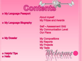 Liuda introduces herself and her best friend Kristina, who both enjoy learning foreign languages and want to visit London. Liuda then presents her English portfolio which includes personal details, her language skills and hobbies. She concludes by testing her grammar and vocabulary knowledge in English.
