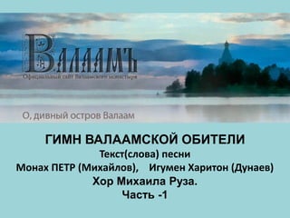 Гимн валаамской обители восхваляет чудесный остров Валаам, описывая его как богоизбранное место, наполненное святостью и чистотой. Он упоминает о прошедших греховных временах и милости Божьей, которая принесла веру и свет, освободив от язычества. Текст подчеркивает духовное значение обители и скорби, которые она перенесла через века.