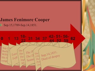 James Fenimore Cooper was an American writer born in 1789 who is known for being the first American author to achieve international literary success. He wrote numerous novels set in the American frontier and early 19th century, including the famous Leatherstocking Tales series following frontiersman Natty Bumppo. Some of his accomplishments include establishing the frontier and wilderness as themes in American literature, contributing different genres like the historical romance and sea novel, and creating one of the first iconic American heroes in Natty Bumppo. While some critics like Mark Twain attacked his works, most scholars agree he played an important role in early American literature.