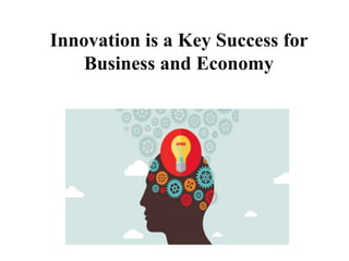 This document discusses innovation and its importance for business success. It defines innovation as the implementation of new ideas through new or improved goods/services. Innovation provides competitive advantages through uncertainty by allowing businesses to get ahead. While risky, innovation demands change that can gain advantages over "good enough." The document provides examples of famous innovators and concludes that innovation, ingenuity, and focus are essential for success in today's complex world. Hiring diverse people encourages challenging ideas to inspire risk-taking and ensure future growth.