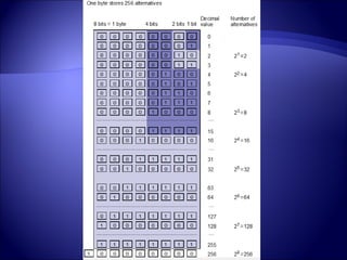 This document discusses how images are represented digitally through binary data and pixels. It explains that images are made up of pixels, each with multiple brightness levels determined by the number of bits used. More bits allows for more brightness levels and possible pixel values. The document demonstrates how binary numbers represent a range of values from 0 to 2^n, where n is the number of bits. It provides examples of the number of possible values for 6-bit and 8-bit binary numbers.