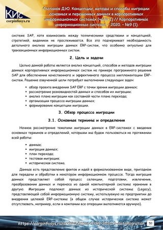 Статья рассматривает миграцию основных и переменных данных в корпоративные информационные системы, в частности на примере SAP ERP. Описание включает ключевые термины, стратегии миграции и этапы внедрения, подчеркивая важность качественного процесса переноса данных для успешной реализации ERP-систем. Цель работы заключается в анализе концепций и методов миграции, а также в формировании стратегии, подходящей для обеспечения эффективной имплементации систем.