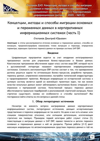 Документ исследует миграцию данных в корпоративных информационных системах, с акцентом на различия между основными и переменными данными, а также стратегии их переноса в систему SAP ERP. Подчеркивается важность качественной миграции для успешного внедрения ERP-систем, обсуждаются этапы процесса миграции и задачи, связанные с документированием и тестированием. Также отмечается нехватка литературных источников по данной теме, что подчеркивает необходимость детального анализа и подготовки во время внедрения систем.