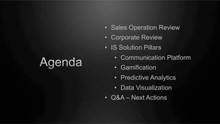 The document outlines a sales acceleration platform that leverages advanced technologies such as predictive analytics, gamification, and data visualization to enhance sales performance. It highlights significant improvements in productivity and sales metrics, including production enhancement and top-line growth, while providing a comprehensive overview of features like local presence and dynamic seek lists for optimizing sales processes. Additionally, it emphasizes the importance of communication and data-driven insights for effective sales strategy execution.