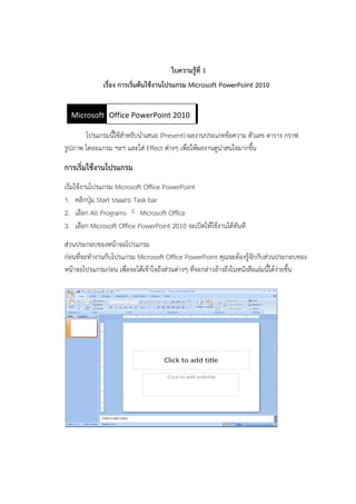 Microsoft PowerPoint 2010 โปรแกรมนี้ใช้สำหรับนำเสนอ (Present) ผลงำนประเภทข้อควำม ตัวเลข ตำรำง กรำฟ รูปภำพ ไดอะแกรม ฯลฯ และใส่ Effect ต่ำงๆ เพื่อให้ผลงำนดูน่ำสนใจมำกขึ้น การเริ่มใช้งานโปรแกรม เริ่มใช้งำนโปรแกรม Microsoft Office PowerPoint 1. คลิกปุ่ม Start บนแถบ Task bar 2. เลือก All Programs Microsoft Office 3. เลือก Microsoft Office PowerPoint 2010 จะเปิดให้ใช้งำนได้ทันที ส่วนประกอบของหน้ำจอโปรแกรม ก่อนที่จะทำงำนกับโปรแกรม Microsoft Office PowerPoint คุณจะต้องรู้จักกับส่วนประกอบของ หน้ำจอโปรแกรมก่อน เพื่อจะได้เข้ำใจถึงส่วนต่ำงๆ ที่จะกล่ำวอ้ำงถึงในหนังสือเล่มนี้ได้ง่ำยขึ้น Microsoft Office Word 2007Office PowerPoint 2010
