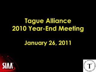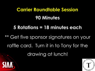 The document outlines an agenda for the Tague Alliance 2010 Year-End Meeting, including a carrier roundtable session with 5 rotations of 18 minutes each on various topics such as social media and Facebook. It also notes there will be a raffle drawing at lunch where attendees can get sponsor signatures on their raffle cards.